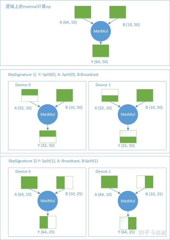 两种合法的signature在两个设备上的示意图如图6所示。假设逻辑上的MatMul的输入输出Tensor的形状是:A(64, 10) X B(10, 50) -> Y(64, 50)。且该Op分布在两个设备上。在第一种SbpSignature下,0号设备上的A是逻辑上A的前一半,1号设备上的A是逻辑A的后一半(按照第0维切分),而两个设备上的B跟逻辑上的B完全一致,两个设备输出的Y分别是逻辑上的Y的前一半和后一半。同样可以分析第二种SbpSignature。