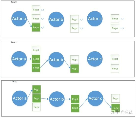 3) 到Time2时刻,Actor b 生产出了Regst_b_0,于是给下游的消费者Actor c发消息说你可以来读我生产的Regst_b_0,同时给上游的生产者Actor a发消息说我用完了你的Regst_a_0。此时Actor a 已经把刚刚生产的Regst_a_1又发给了Actor b,Actor b检查自己仍有Regst_b_1空闲,于是Actor b开始读Regst_a_1,写Regst_b_1;Actor c收到Regst_b_0,发现自己有Regst_c_0空闲,于是Actor c开始执行,读Regst_b_0, 写Regst_c_0;Actor a收到了Actor b用完还回来的Regst_a_0,检查Regst_a_0所有的消费者都用完了,于是将Regst_a_0回收,标记为空闲块,同时Actor a还可以继续执行,写Regst_a_2。