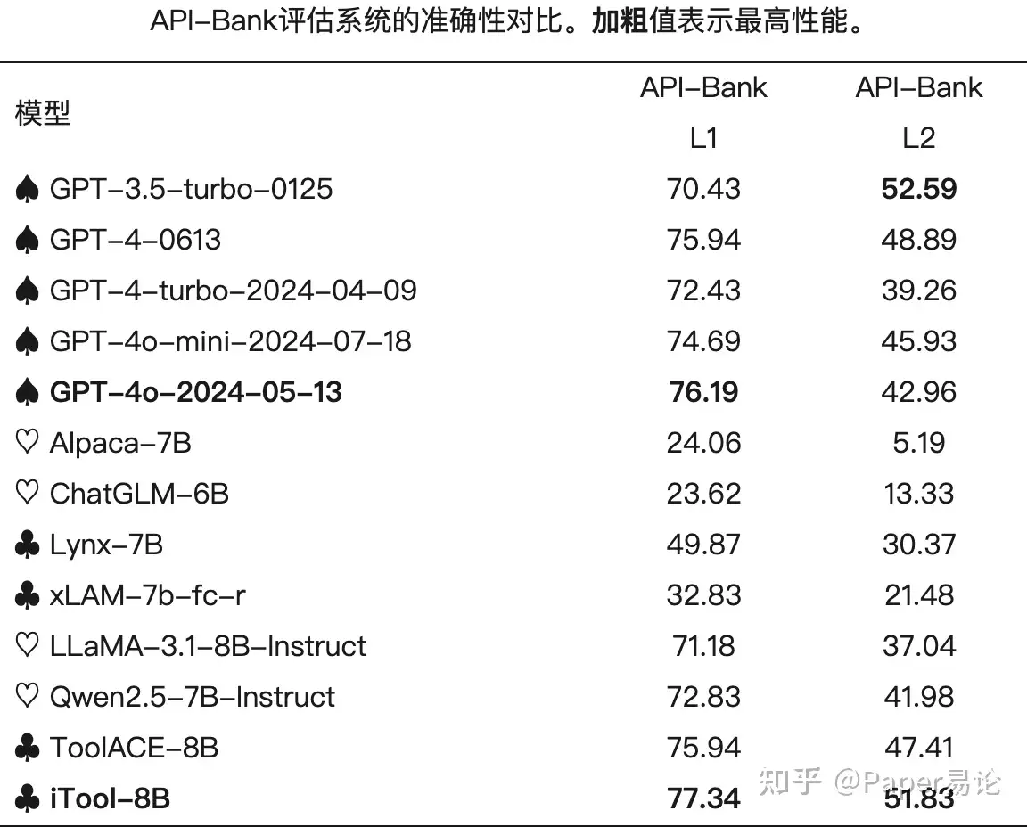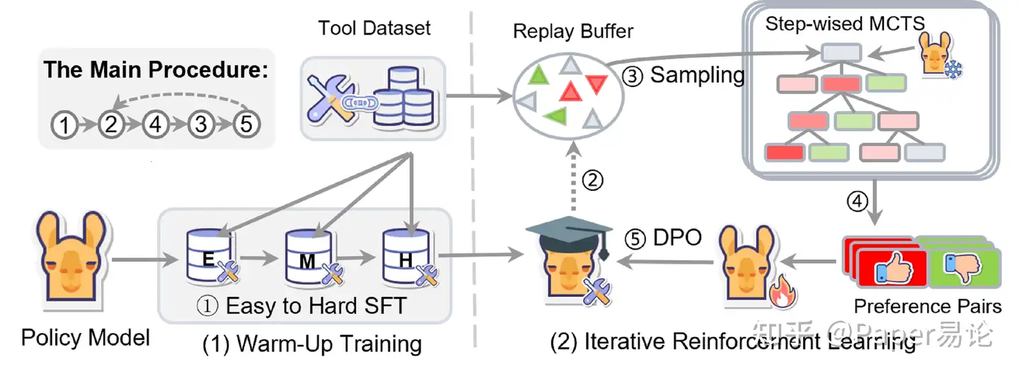 为此,我们提出了一种新颖的学习方法,帮助模型在复杂场景中弥补差距:MCTS路径探索确保数据多样性,而ReFT逐步增强模型在面对缺陷时的能力。具体来说,我们提出了一个 迭代 强化微调策略,用于 工具 使用,命名为 iTool 。它首先基于策略模型的反馈迭代识别与缺陷相关的数据。然后进行MCTS以收集细粒度偏好对,这有助于探索数据多样性和精确定位缺陷。最后,应用直接偏好优化(即强化学习策略 (Rafailov等, 2024) )以使模型的响应与真实响应对齐,并使其与有缺陷的响应错开。此外,在迭代ReFT之前,我们提出了一种从易到难的SFT热身策略,以从复杂场景中学习。通过这些改进, iTool 展示了大约3%优于同规模模型的性能。尽管只有7B参数,它仍优于较大的开源模型,并能与顶级闭源模型(如GPT系列)竞争。