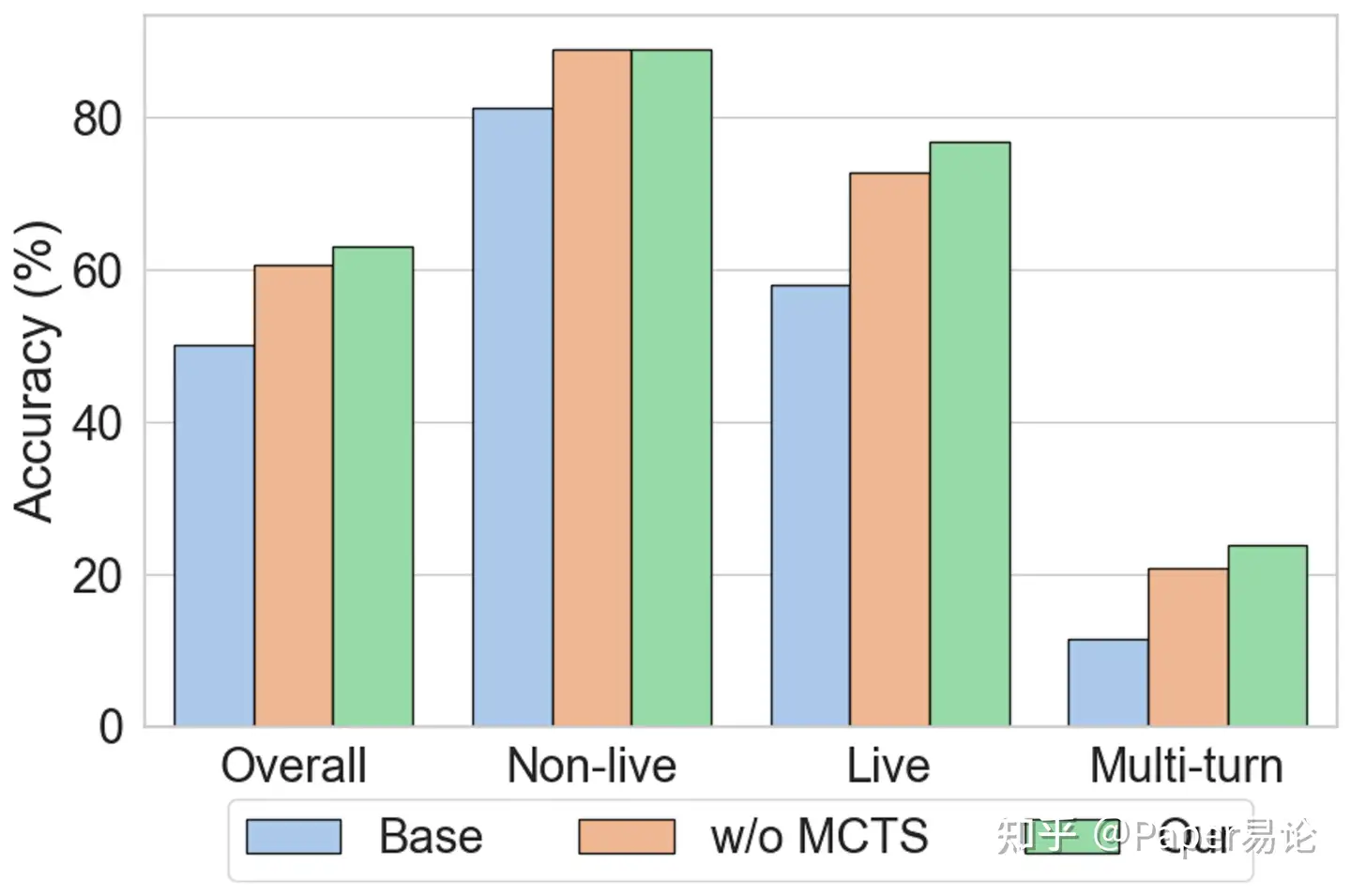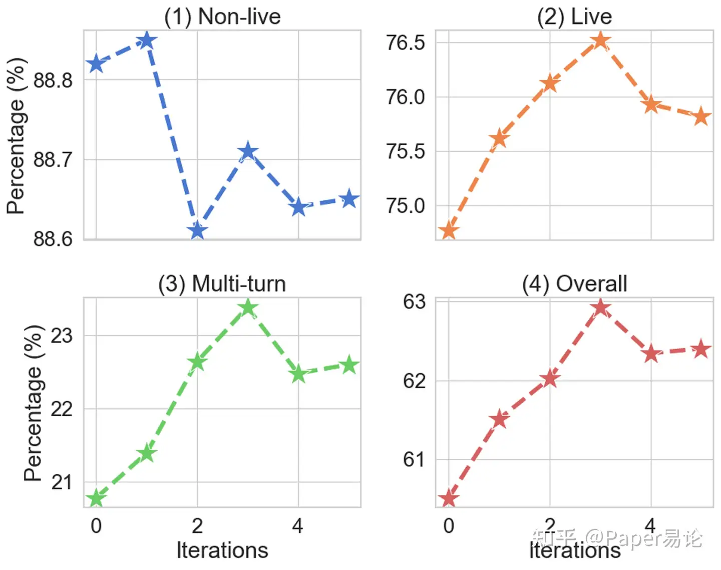 - 在迭代强化学习中,我们对MCTS和迭代次数进行了研究。 结果分别如图 6 和图 7 所示。为了替换MCTS,我们从策略模型中采样四个响应,并选择具有最高和最低概率的响应作为偏好对。这些对随后用于后续的偏好优化(w/o MCTS)。从图 6 可以看出,当MCTS被替换时,模型的性能下降。从图 7 可以看到,随着迭代次数的增加,我们的方法最初呈现上升趋势,然后开始下降。模型在大约3次迭代时表现最佳,尤其是在 多轮 和 实时 场景中。这表明MCTS可以通过少量迭代有效缓解数据多样性不足的问题。然而,过多的迭代可能导致过拟合,从而降低数据多样性。 iTool 在 非实时 中的表现较差。这表明它专注于增强复杂工具使用情况下的性能,可能以牺牲简单工具使用情况为代价。
