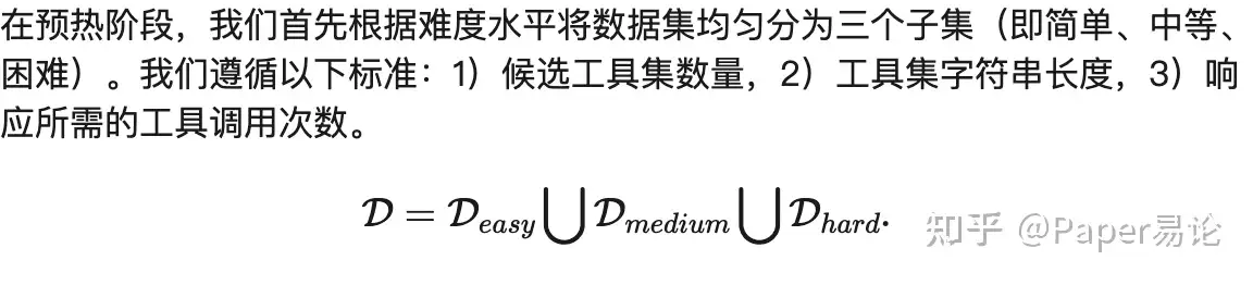 在实际应用中,工具使用模型应从复杂的候选工具集中选择多个工具并正确安排它们(即硬模式),而不是直接使用单一候选工具进行响应(即易模式)。类似于人类学习程序,工具学习模型可以从易到难的课程设置中受益 (B. Xu等, 2020) 。因此,我们提出了一种从易到难的SFT进行预热训练。