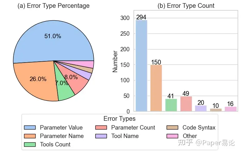为了进一步探讨这个问题,我们进行了不良案例分析。我们统计了BFCL中 实时 和 非实时 的所有错误类型,并将其分类如图 3 所示。这里, 参数值 表示参数值或类型与真实值不匹配。 参数名 表示无法从用户查询中识别参数值。更多详情请参见附录 8 。从图 3 可以看出,错误高度集中在 参数值和名称 错误中。在工具调用中,参数值和名称仅占模型响应文本的一小部分。换句话说,在模型的错误响应中,大部分内容实际上是正确的,只有一小部分是不准确的。我们将此称为模型的缺陷。