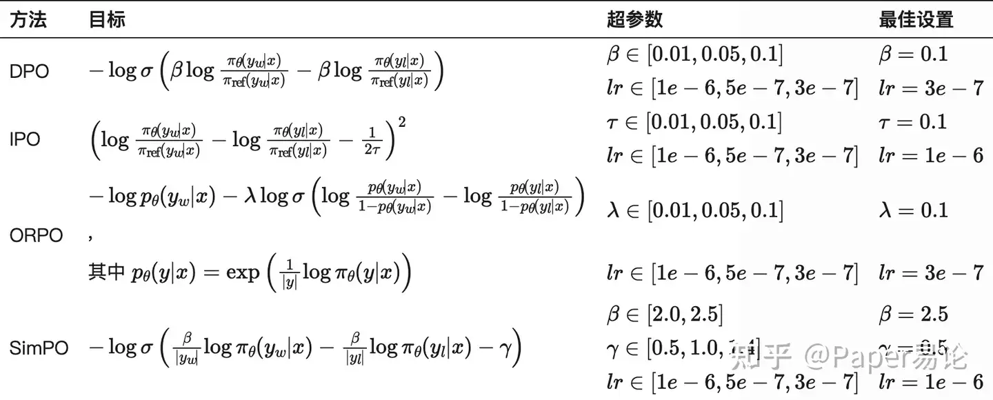 从人类反馈中学习对于使LLMs与人类意图对齐至关重要 (Leike等, 2018) ,这被称为强化学习。ReFT通过将强化学习与监督微调(SFT)结合,利用奖励信号优化模型性能。在线强化学习算法 (Schulman等, 2017; R. Zheng等, 2023) 复杂且难以优化。最近,直接偏好优化(DPO) (Rafailov等, 2024) 提出了一种更简单的离线算法,重新参数化奖励函数以直接从偏好数据学习策略模型,提高了简单性和训练稳定性。此外,还提出了各种偏好优化目标,例如 SimPo (Meng, Xia, 和 Chen 2024) , IPO (Azar等, 2024) , ORPO (Hong, Lee, 和 Thorne 2024) 和 KTO (Ethayarajh等, 2024) 。