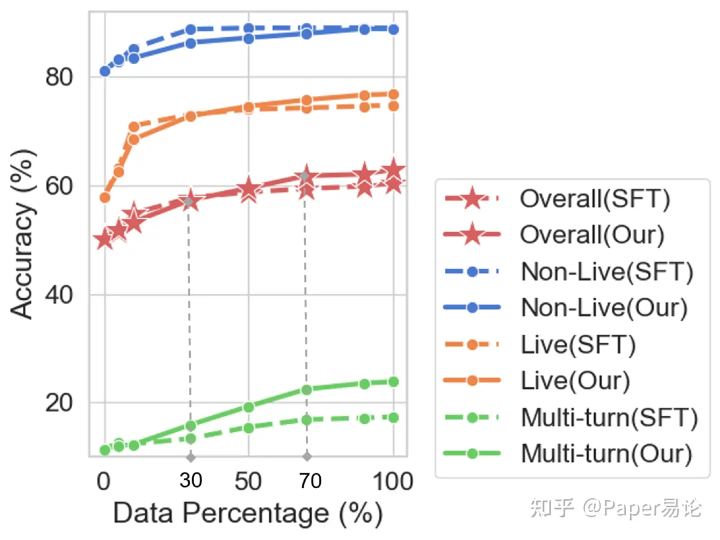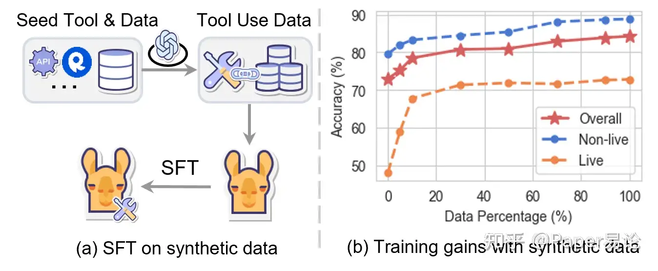 工具使用流程进行SFT(监督微调)使用合成数据(a)。然而,如图(b)所示,随着合成数据的增加,其训练增益显著下降。 Live 和 Non-Live 分别表示复杂和简单的工具使用场景。