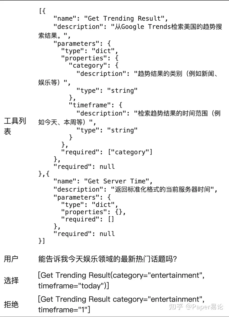 表 [tab:case_pair1] 展示了一个偏好对的例子。 选择 响应正确地使用了“获取趋势结果”工具及其合适的参数以响应用户的请求。相反, 拒绝 响应格式不正确,省略了必要的括号,并错误地将值 1 赋予了 timeframe 参数,展示了工具应用的错误。