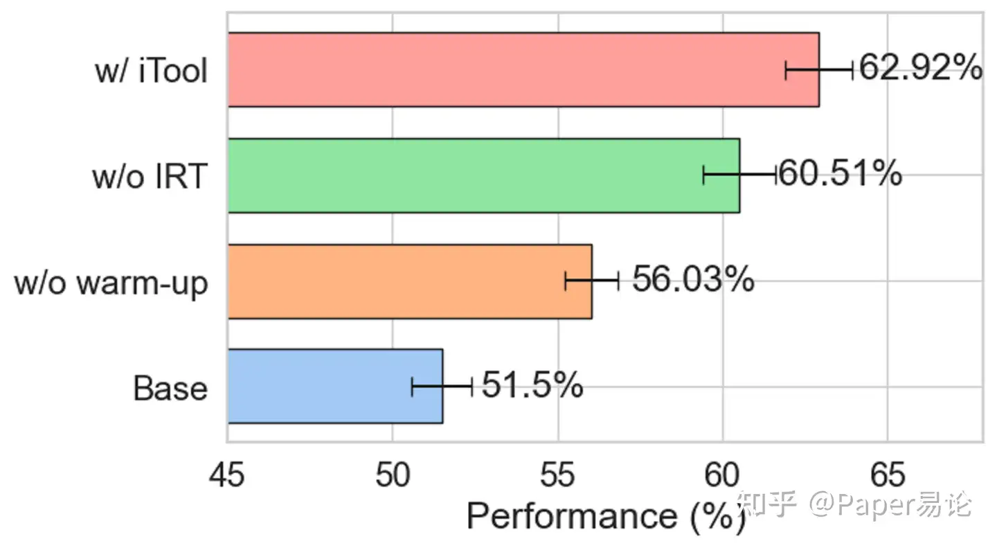 为了评估我们方法中两个组件的有效性,我们进行了消融研究,移除了 (1) 预热训练 ( w/o warm-up ) 和 (2) 迭代强化学习 ( w/o IRT )。我们还将 Llama-3.1-8B-Instruct 作为 base 模型进行比较。从图 4 可以看出,所有组件在我们的方法中都是必不可少的。预热训练相较于IRT对我们的方法有更大的影响,这证明了其在强化学习之前的不可或缺性。