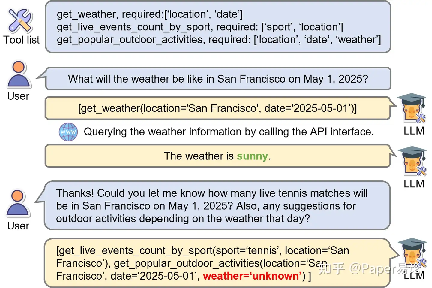 工具使用的说明。给定一组包含“必需”参数的工具。在接收到用户查询后,LLMs从候选工具中选择工具,然后执行API调用操作,最终回复用户。在此案例中,LLM正确回答了第一个查询,但在第二个查询中失败,因为无法识别‘天气’中的‘晴天’。
