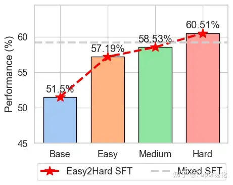 - 在预热训练中,我们对易到难SFT策略进行了研究。 我们展示了从简单到复杂的性能进展,并将其与混合SFT策略和基础模型进行了比较。为了进行公平的比较,我们从ToolACE中为所有策略使用了相同数量的数据。实验结果总结在图 5 中。从结果来看,我们的策略显示出逐步改进并超过了混合SFT。从 基础 到 简单 有显著的跃升,而从 中等 到 困难 是第二大改进。这表明模型从易到难的课程学习过程中受益。在合成数据中,模型可以在较简单的阶段快速学习工具使用的任务模式,从而有利于处理更复杂的场景。