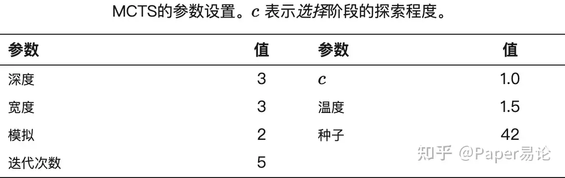 MCTS-base RL的实现设置 。在MCTS的 扩展 阶段,自评估提示如表 [eval_prompt] 所示。在计算正确性的置信分数时,我们评估策略模型在四个选项( A, B, C, D )上的标记级别概率,权重分别为1.0、0.1、-1.0和-2.0。我们对模型响应进行四次采样,并使用这些样本的加权平均值作为最终置信分数。
