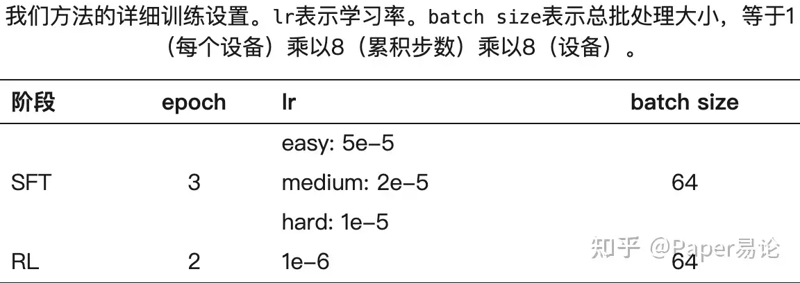 实现设置 。由于资源限制,我们在SFT热身阶段采用LoRA( rank =16 和 alpha =32)进行参数高效训练,并在强化学习(RL)阶段采用QLoRA(来自bitsandbytes库 5 的量化方法,4位)。我们使用余弦学习率调度器,预热比例为0.1。更详细的训练设置见表 2 。
