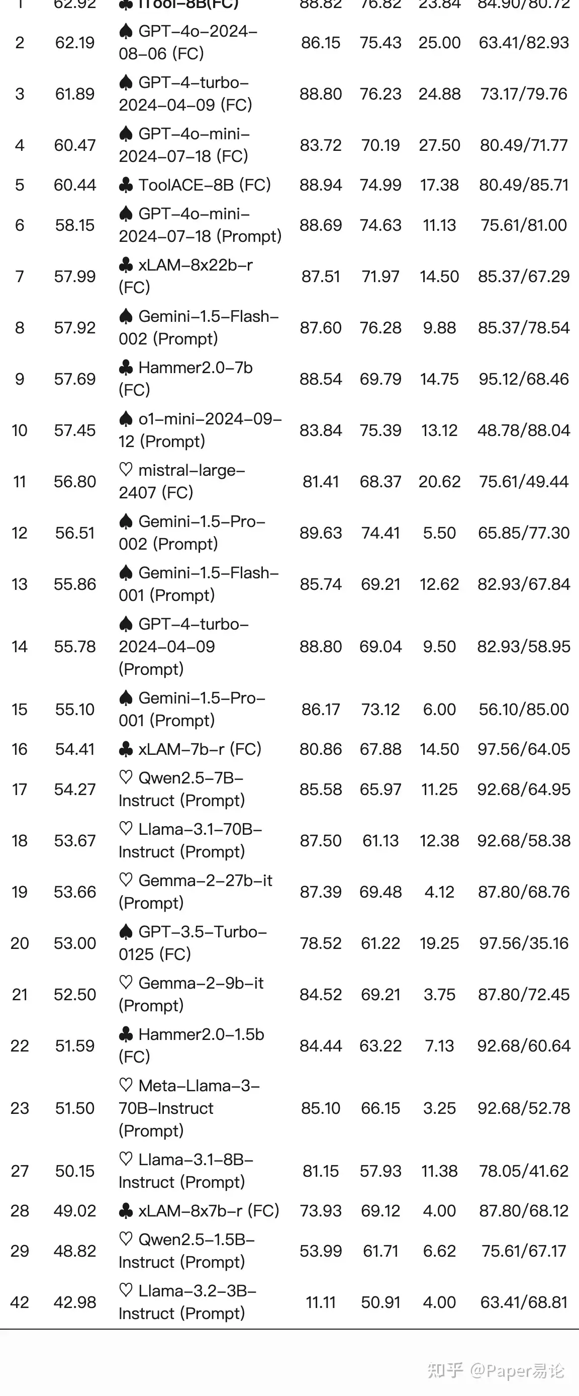 基线模型 我们将整体性能与最先进的闭源模型(例如GPT系列 3 , Gemini 4 ) 和开源模型(例如 Llama-3.1-8B-Instruct, Qwen2.5-7B (Team 2024) ),以及使用工具使用数据集微调的开源模型进行比较,包括 ToolACE-8B(在ToolACE上微调Llama-3.1-8B-Instruct)模型、xLAM系列 (Zhang等, 2024) 和 Hammer系列 (Lin等, 2024) 。