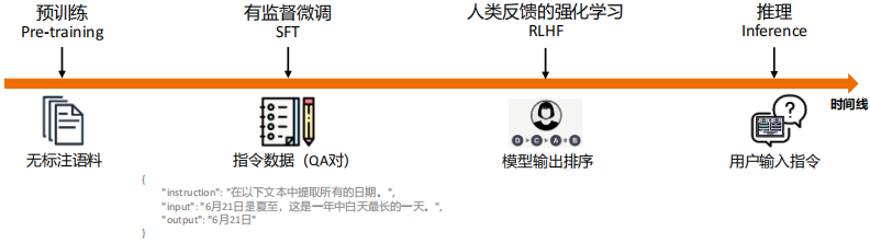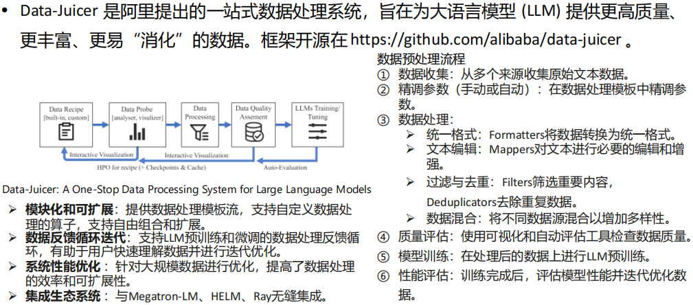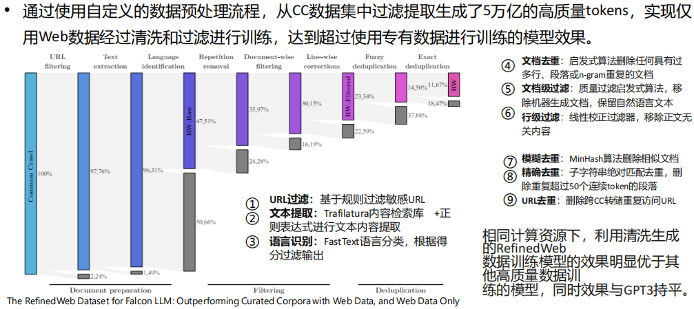 ①其中预训练过程需要的数据量最大,涉及网页数据、开源数据集等,数据质量参差不齐,需要进行大量数据预处理
