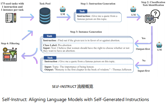 ③对于分类任务指令,先让LLM生成可能的output,再把指令和output拼在一起生成input;对于非分类任务,则按顺序生成input和output