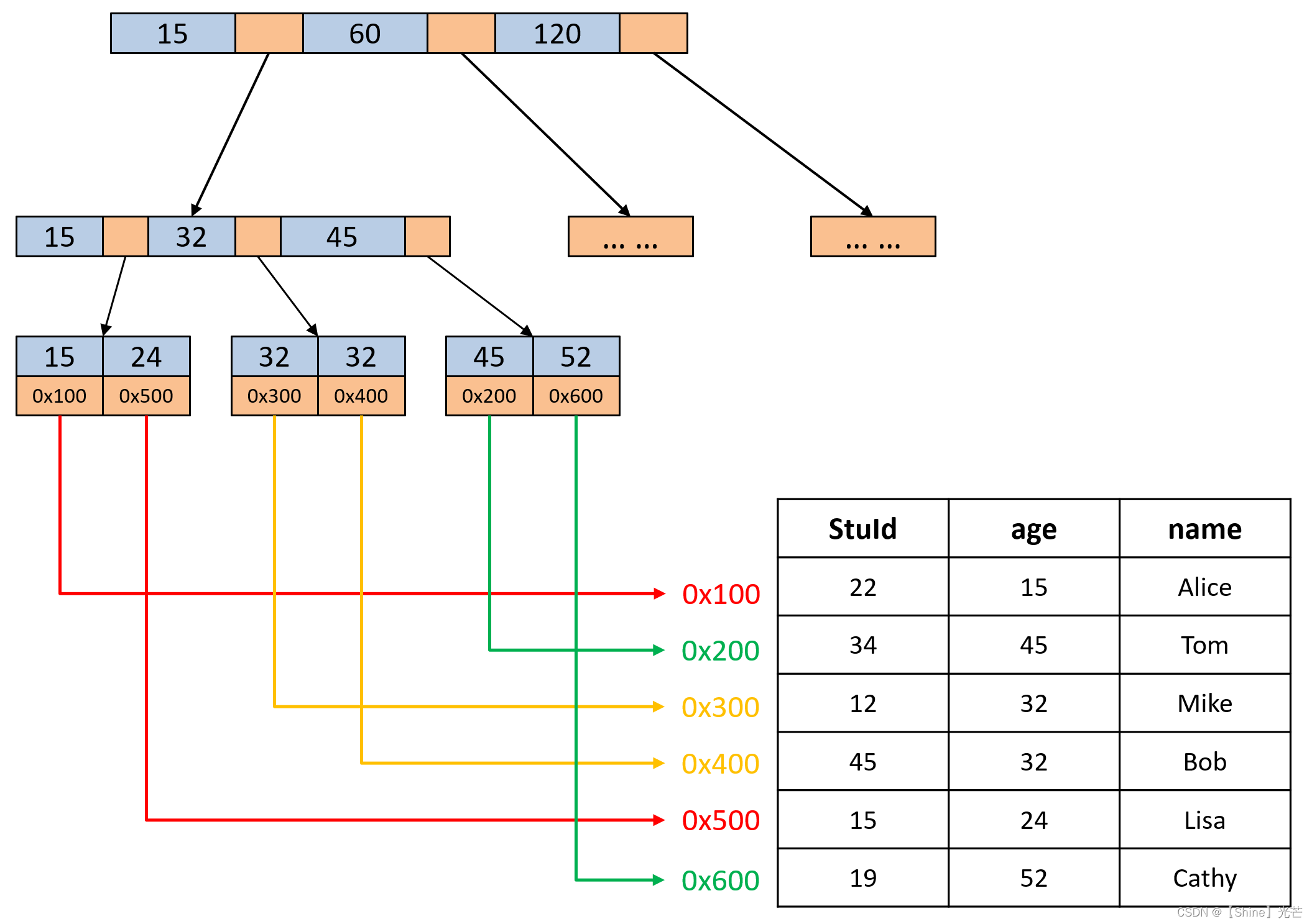 在早期的MySQL数据库中,所使用的搜索引擎都是MyISAM,这种搜索引擎不支持事务,支持全文索引,其使用的数据结构是B+树。在MyISAM搜索引擎中,叶子节点中的data域存储的是数据在磁盘中的地址,而不是数据本身。如图5.1所示的学生信息管理数据库,要记录学生的学号(StuId)、年龄(age)以及姓名,B+树用于检索,图5.1中选取的主键为StuId。