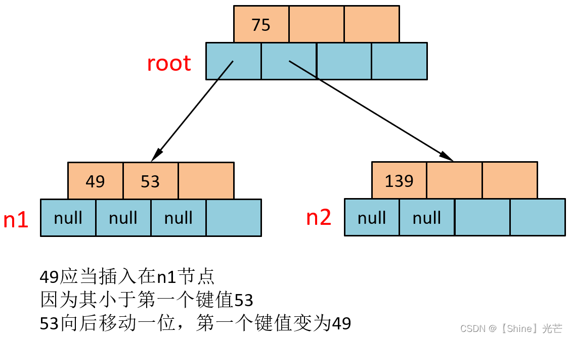 首先检索节点插入的位置,发现49小于根节点root的第一个键值,因此找到n1节点,n1节点为叶子节点可以执行插入操作,49小于第一个节点53,所以应当将53向后移动一位并将49设置为n1节点的第一个键值。