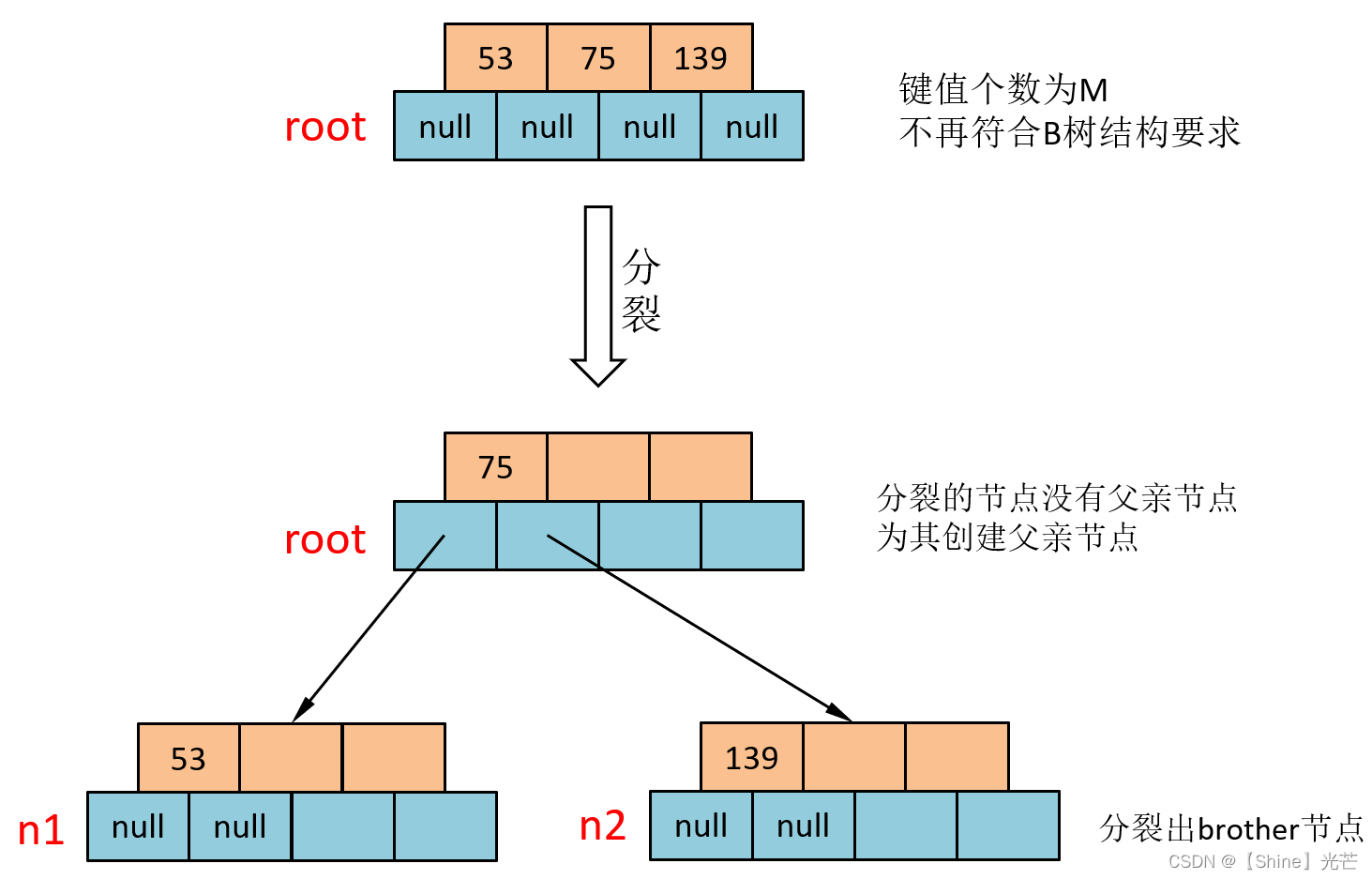 75位于53和139之间,所以第一步要现将75插入到root节点的这两个值之间。但是,插入75后root节点就有了3个键值,这样就不符合B树的结构要求,需要进行分裂。