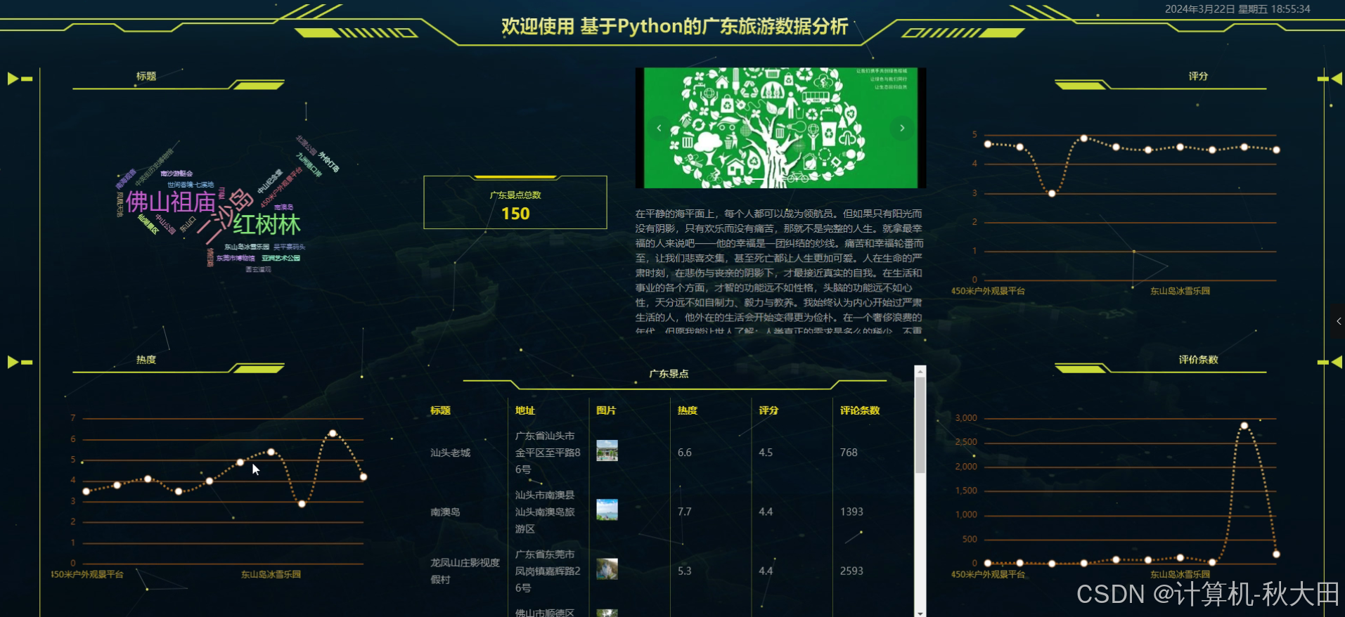 为实现这一目标,项目构建了一套完整的数据采集与处理体系。通过先进的爬虫技术,广泛搜集互联网中与广东旅游相关的多元数据,涵盖了海量的用户评论、详尽的景点基础信息(如地理位置、开放时间、特色标签等)以及各类旅游产品的价格数据等。面对采集到的原始数据中可能存在的重复、缺失、异常等问题,项目进行了严谨的数据清洗与预处理工作,包括剔除无效信息、补全关键字段、统一数据格式等,确保数据的准确性与可用性,为后续分析奠定坚实基础。