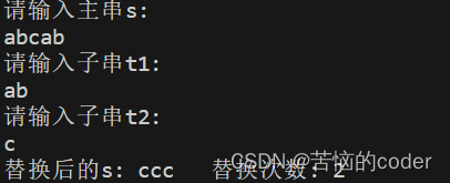从键盘输入主串s以及子串t1和t2。编写程序,将主串s中所有t1子串替换为t2子串,输出替换后得到的串以及t1被替换的次数。要求子串查找采用改进KMP算法。