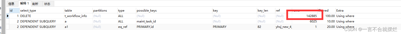 它以为着两步走:第一步:【先执行外部SQL查询】MySQL根据”DELETE FROM t_workflow_infoWHERE” 得到一个大结果集t1,其数据量就是全表所有行了,假设是85万行。即使这两部查询都用到了索引,也是巨慢的。第二步:【后执行内部SQL子查询】第一步的大结果集t1中的每一条记录,都将与子查询SQL组成新的查询语句:SELECT。DEPENDENT SUBQUERY: 子查