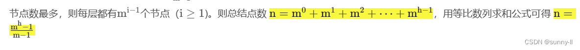 💦 性质3:高度为 h 的 m 叉树至多有 m^h-1/m-1 个节点