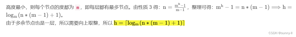 💦 性质4:具有n个结点的m叉树的最小高度为⌈logm(n*(m-1)+1)⌉
