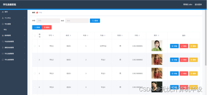 5.1.2 学生管理 管理员进入指定功能操作区之后可以管理学生信息。其页面见下图。学生是本系统的一个角色,其相关信息需要管理员添加,修改,删除等。