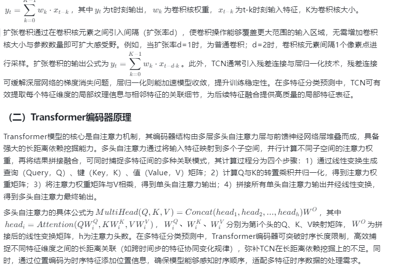 时间卷积神经网络(TCN)凭借扩张卷积与因果卷积特性,具备强大的局部特征提取能力,可有效捕捉多特征数据中的局部关联与精细细节;Transformer模型的自注意力机制能够突破时序建模的长度限制,高效挖掘多特征间的长距离依赖关系;门控循环单元(GRU)则通过更新门与重置门的协同作用,擅长捕捉时序数据的动态变化规律,且计算复杂度低于LSTM。将三者融合构建TCN-Transformer-GRU组合模型,可实现“局部特征提取-长距离依赖挖掘-时序动态建模”的优势互补,解决单一模型在多特征分类预测中的局限性。然而,现有研究中多模型融合多采用简单拼接方式,未形成高效的特征融合机制,且针对多特征分类任务的模型结构适配性不足,制约了组合模型性能的充分发挥。