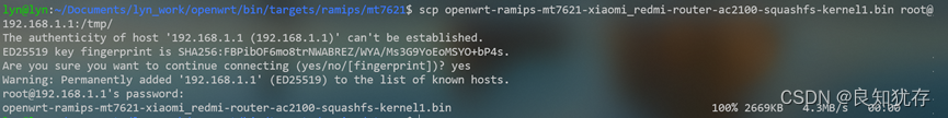 scp openwrt-ramips-mt7621-xiaomi_redmi-router-ac2100-squashfs-kernel1.bin root@