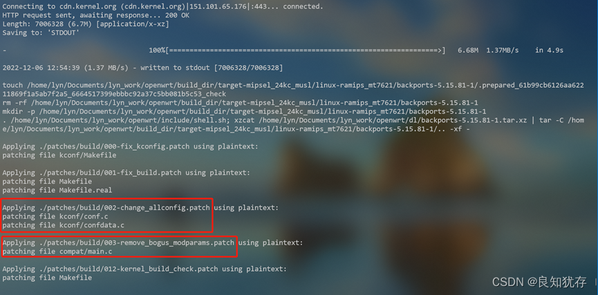 这个是在查看编译时候,我们可以看到,openwrt会下载一堆文件,文件解压之后发现会进行apply打补丁操作,然后进行编译,这个操作做模块话编译很方便,像之前Linux其他设备编译时候,我们会看到各种芯片定义文件都有,然后编译的时候进行选择编译,而openwrt直接进行了精简,源码是最精简的,每次选择之后网络下载包,进行打补丁之后编译,这个操作对很大项目或者项目维护的方案很执行推荐。