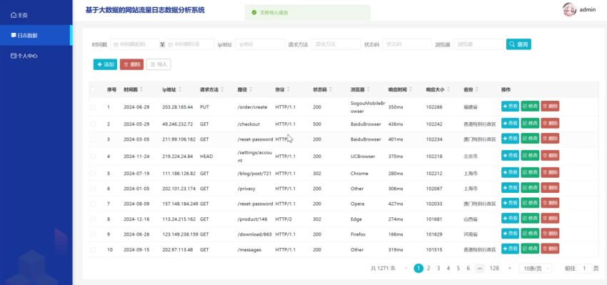 管理员在日志数据管理模块中,通过数据爬虫技术自动抓取流量日志信息,并进行数据清洗以保障信息准确性。模块允许管理员查看日志数据信息详情、修改信息、删除记录以及查询。系统提供了友好的操作界面,管理员可轻松编辑信息,而爬虫功能则后台自动运行,确保数据的实时更新和高质量,从而有效支持管理员的日常信息管理工作。在该模块设有数据导入模块,通过上传excel表格进行导入数据,即使原始数据量有限,也能扩充数据集以供分析和测试使用。