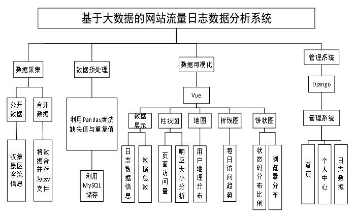 本研究的实施分为四个主要步骤:数据采集、数据预处理、数据分析和数据可视化。首先,进行了数据采集工作。从公开渠道收集了大量与网站流量日志相关的数据,包括每日访问趋势,业务面访问量,状态码分布比例,响应大小分析,用户地理分布,浏览器分布,日志数据等。为了确保数据的全面性和准确性,还对这些数据进行了合并和处理,将其整合为一个统一的CSV文件格式。接下来是数据预处理阶段。由于原始数据可能存在缺失值和不一致的地方,需要对其进行清洗和整理。使用了Pandas库来读取CSV文件,并对数据进行筛选、填充缺失值以及去除重复项等操作。经过这一系列的处理,的数据集变得更加干净和有序。然后进入数据分析环节。利用Spark框架对预处理后的数据进行深度挖掘和分析。通过编写自定义脚本,对不同网站的流量日志情况进行了比较,分析了页面访问、浏览器发布、状态码分布等因素对流量日志的影响,并得出了相应的结论和建议。最后是数据可视化部分。将分析得到的结果转化为图表形式,以便于理解和传播。使用了Vue.js框架来创建交互式的网页界面,管理员可以通过点击不同的按钮来查看各种统计信息和趋势图。此外,还制作了地图图和饼状图来展示某些特定的数据分布情况。