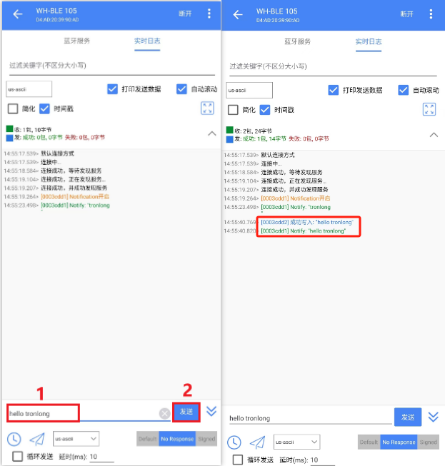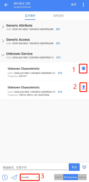 蓝牙连接后,在手机APP操作界面点击对应图标订阅"NOTIFY",并使能"WRITE,WRITE_NO_RESPONSE",然后设置字符类型为"us-ascii",如下图所示。