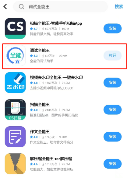 本案例测试需准备一台智能手机。将手机蓝牙功能开启,在手机应用商店搜索“调试全能王”APP进行蓝牙测试工具安装。