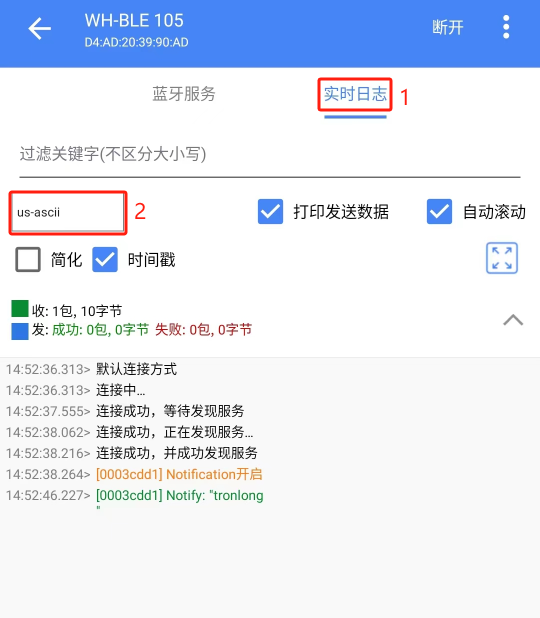 在手机APP操作界面,点击“实时日志”,并设置字符类型为"us-ascii",接收到的数据如下图所示。