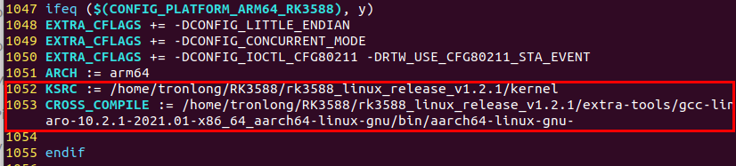 CROSS_COMPILE := /home/tronlong/RK3588/rk3588_linux_release_v1.2.1/extra-tools/gcc-linaro-10.2.1-2021.01-x86_64_aarch64-linux-gnu/bin/aarch64-linux-gnu- //设置交叉编译工具链