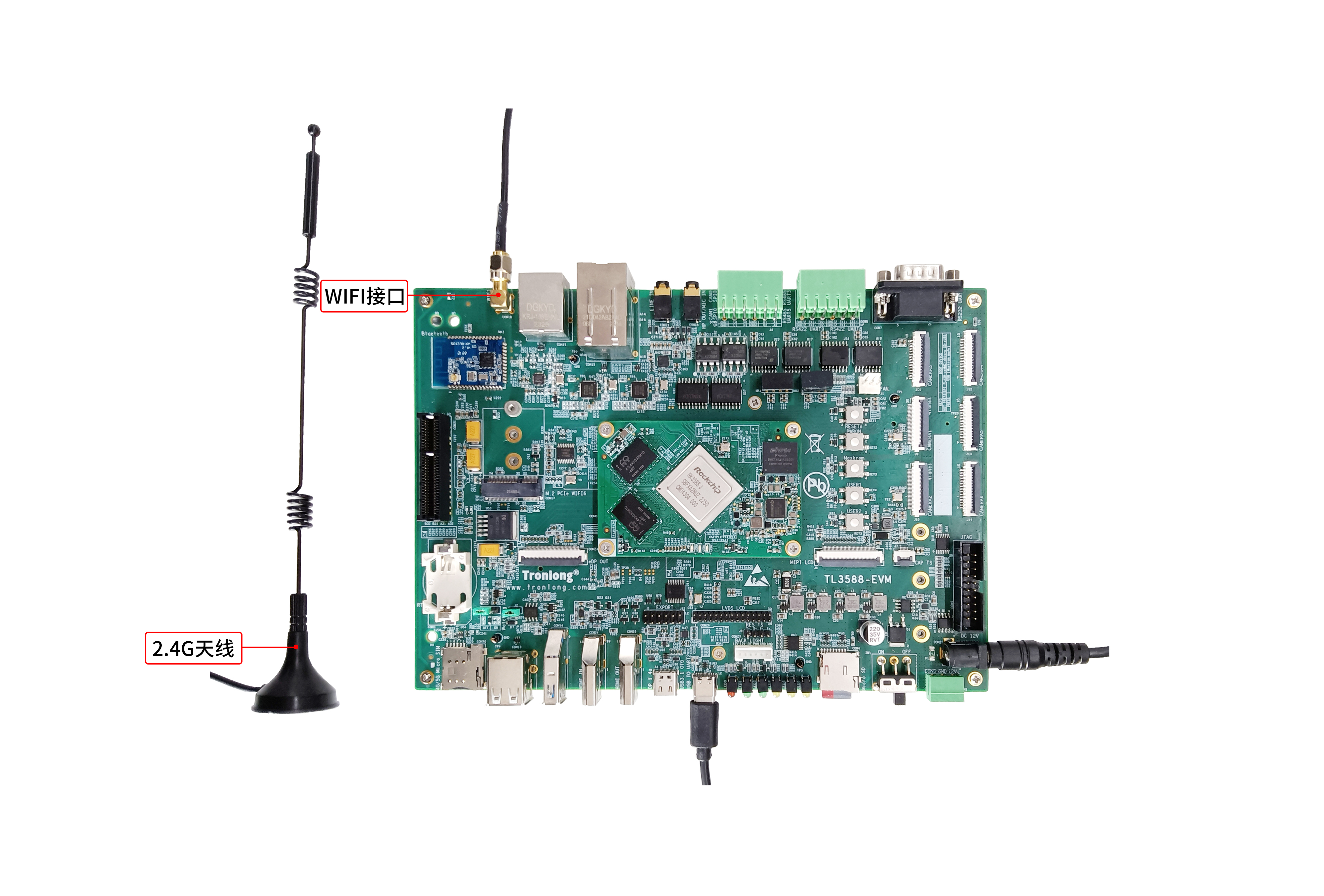 评估板已板载WIFI模块,型号为:必联BL-R8188EU2,支持STA和AP模式。请将2.4G天线接至评估板的WIFI(CON18)接口,如下图所示。