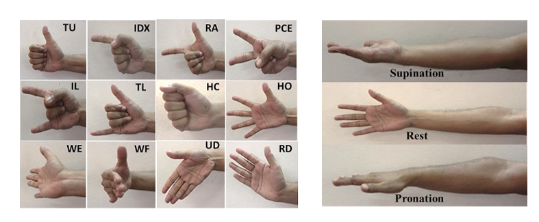 为应对上述挑战,本文引入了一个新颖的sEMG数据集,该数据集系统收录了十九名健全受试者在三种不同前臂方向(放松静息姿势、中立位姿势和半握拳预备姿势)下执行十二种手指与手腕动作时的肌电信号。 基于该数据集,研究首先对信号进行预处理,随后提取统计时域特征,并通过相关系数法进行特征筛选,最终利用随机森林(RF)分类算法对三种前臂方向及十二类手势动作进行识别与预测。通过这一系统性探索,本文旨在探究动态姿态变化下手势识别的可行性与稳定性,为开发适应性更强、鲁棒性更高的义肢控制与人机交互系统提供新思路与方法支持。