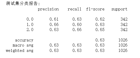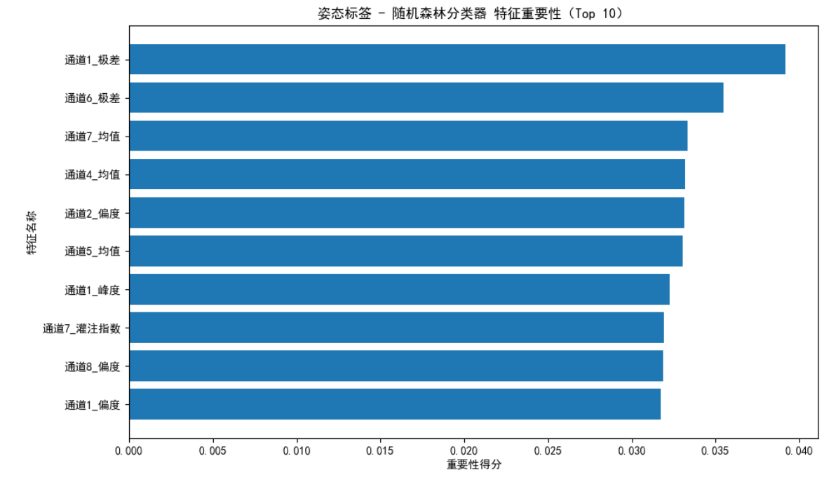 如图8所示,在涵盖 1026 个样本(3 类姿态,每类样本量均为 342 个)的测试集上,模型整体准确率为 0.63,macro avg 与 weighted avg 维度下的 precision、recall、f1-score 也均为 0.63,说明模型对 3 类姿态的分类效果虽均衡,但综合性能偏弱;从具体类别表现看,3 类姿态的 f1-score 集中在 0.62-0.65 之间,差异较小,其中标签 2.0 的 f1-score(0.65)略占优势,标签 0.0 的 f1-score(0.62)稍显不足,但整体未出现像手势分类中那样明显的 “识别短板类别”;如图9所示,特征重要性方面,“通道 1_极差” 的重要性得分最高(接近 0.04),是驱动分类的核心特征,但前 10 个特征的重要性得分集中在 0.025-0.04 之间,分布相对平缓,并未出现某一特征的绝对主导性。