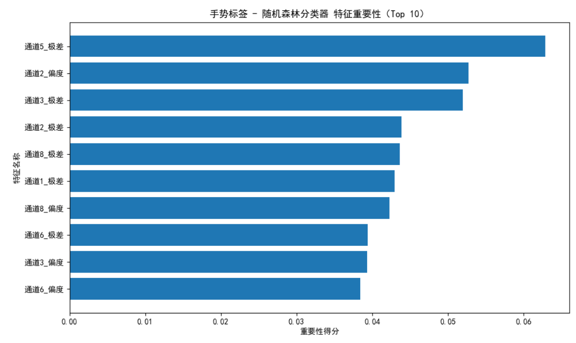 如图6所示,在 1026 个样本(12 类手势,每类样本量 85-86 个)的测试集上,模型整体准确率为 0.78,各类别 precision、recall 及 f1-score 的宏观与加权均值也均为 0.78,说明模型分类效果较均衡且无明显样本偏向,但综合性能仅处于中等偏上水平;从各类别表现看,标签 5.0、11.0 的 f1-score(0.83、0.85)及 recall(均为 0.93)相对突出,而标签 0.0 的 f1-score 仅 0.56(precision=0.61、recall=0.52),是识别效果最差的类别,存在明显的分类混淆风险,其余多数类别 f1-score 集中在 0.77-0.81 之间,表现稳定但未达高精度;如图7所示,特征重要性分析则显示,“通道 5_极差” 的重要性得分最高(接近 0.06),是分类的核心驱动特征,前 5 个重要特征得分均超 0.05,而 “通道 6_偏度” 得分最低,对分类影响较弱,且前 10 个特征均为数据统计量(极差、维度、偏度等),说明模型主要依赖手势数据的统计特征完成分类。整体而言,模型分类表现稳定但存在部分类别识别短板,后续可针对标签 0(TU)优化样本或特征。