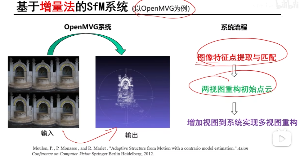 SfM系统解析,以OpenMVG为例OpenMVG 是一个,主要用于,也就是从多张 2D 图像中恢复出 3D 场景结构和相机位姿文章链接:计算机视觉之三维重建(深入浅出SfM与SLAM核心算法)—— 8.运动恢复结构(SfM)系统解析_哔哩哔哩_bilibili。