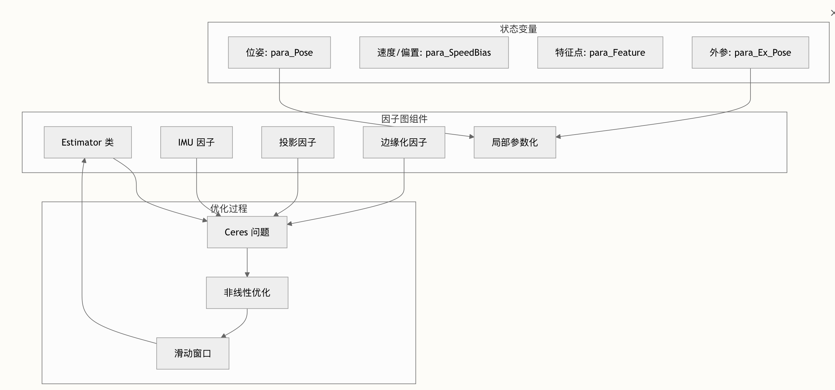 因子图优化集中在 Estimator 类 estimator.h 中,该类协调多种因子类型以实现鲁棒的状态估计。系统采用滑动窗口优化方法,为不同的传感器模态精心设计残差块。