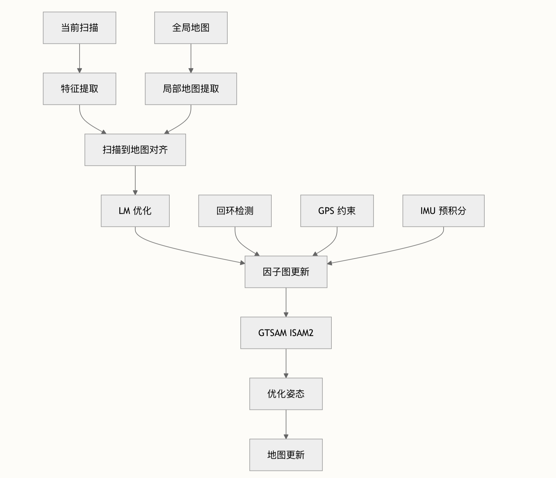 - 地图优化 (mapOptmization.hpp):执行扫描到地图的优化,包含闭环检测和全局一致性维护