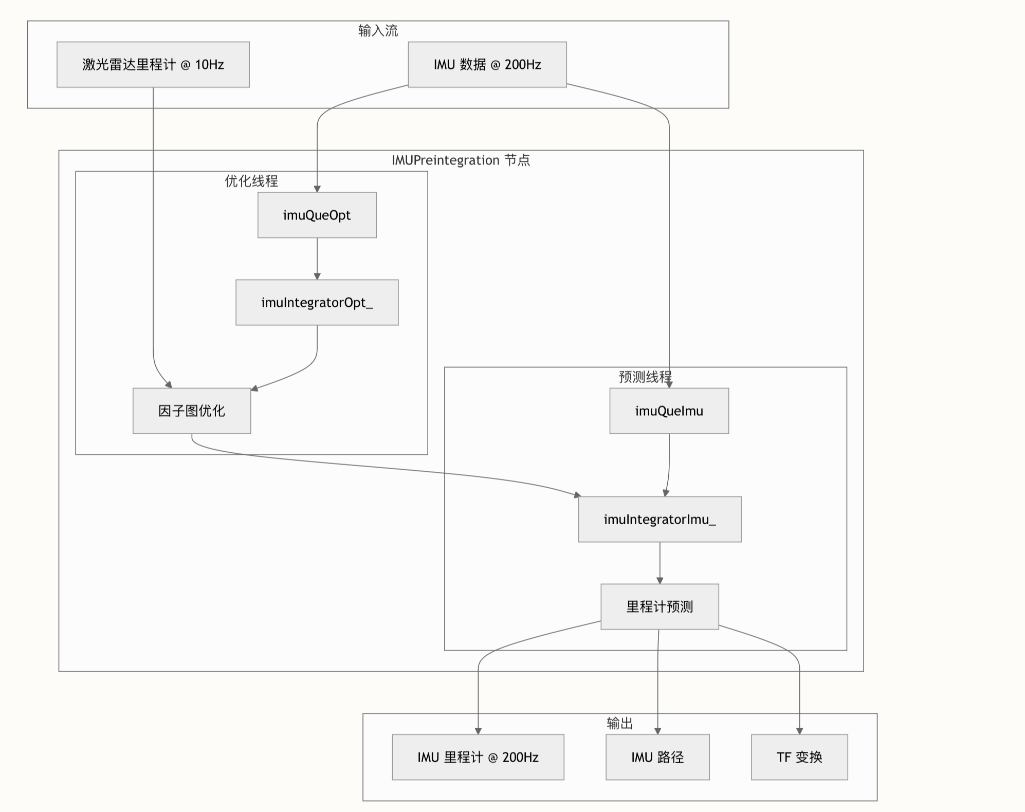 IMU 预积分模块采用双线程架构运行,维护两个独立的预积分积分器,分别用于优化和实时预测。该架构利用 GTSAM 的因子图框架实现紧耦合传感器融合,并支持高效的增量优化。