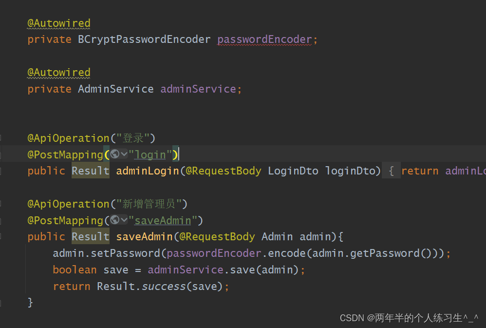 public String getPassword() {return admin.getPassword();}这个方法是获取密码,也就是security会从这里获取登录的密码,我们就把我们的用户类的密码让他返回