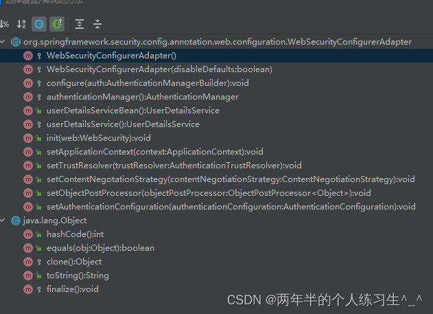 我们创建一个配置类SecurityConfig(使用@Configuration标记)并且继承WebSecurityConfigurerAdapter类,重写里面的几个配置方法即可对springsecurity进行配置