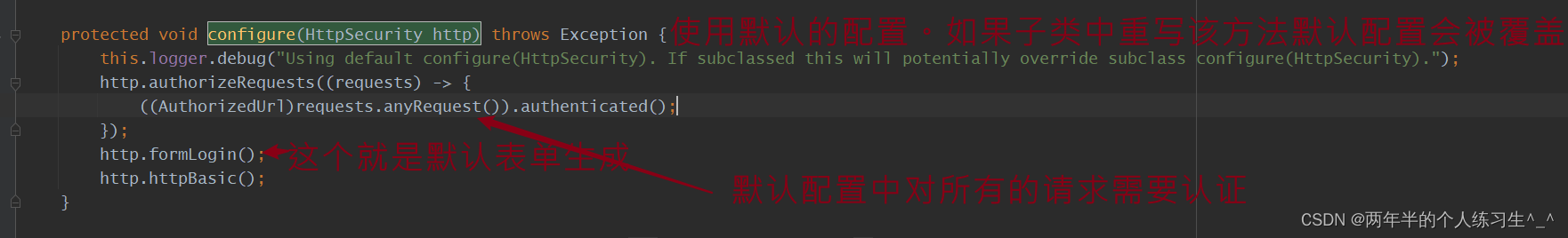 我们可以看到源码中的该方法中默认对所有的请求进行拦截,并且默认生成表单登录页面,并且使用基本认证。