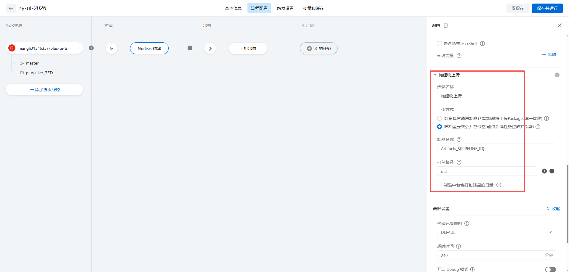 上传方式选择公共空间,打包路径根据自己的项目结构修改