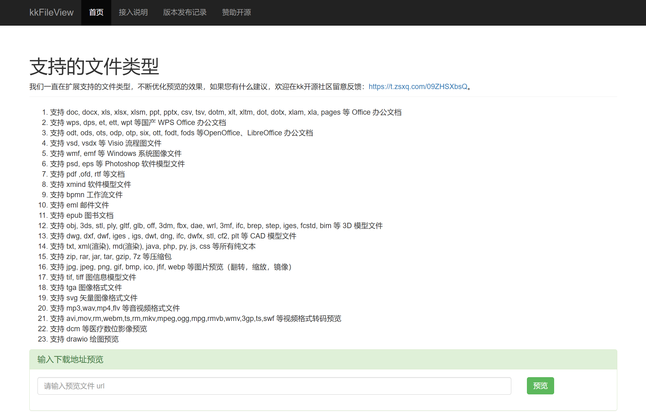 gitee仓库地址:kkFileView: 使用spring boot打造文件文档在线预览项目解决方案,支持doc、docx、ppt、pptx、wps、xls、xlsx、zip、rar、ofd、xmind、bpmn 、eml 、epub、3ds、dwg、psd 、mp4、mp3以及众多类文本类型文件在线预览。