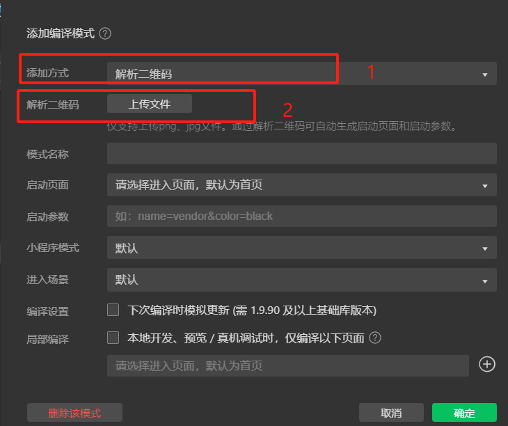 二、在添加方式直接选择要扫描的解析二维码,上传需要解析的二维码图片,会自动解析生成启动页面和启动参数。一、点击编译按钮左侧配置编译模式,打开选择框选择“添加编译模式”。3,点击确定按钮就可以识别二维码了。