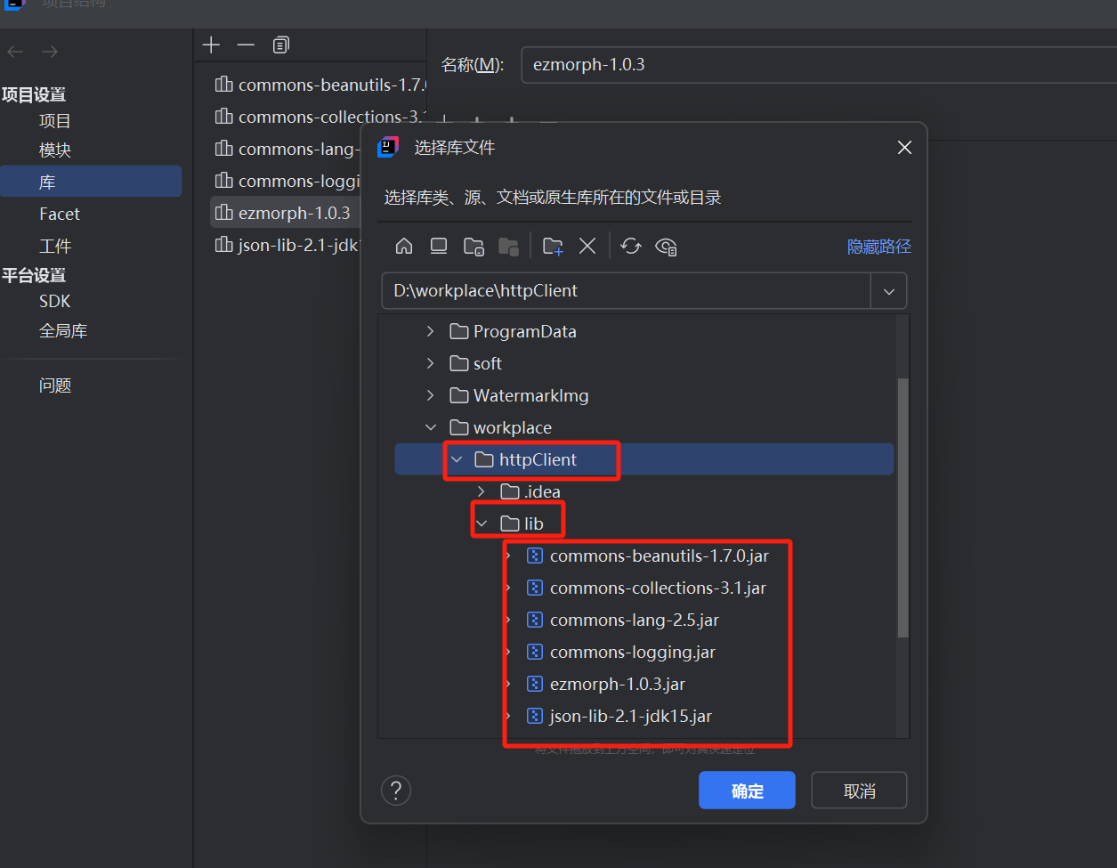 2、将下载的jar包注入本地IDEA编辑器。注意:不需要使用下面引入包的形式。依次将6个jar包添加。3、一定要点应用和确定。